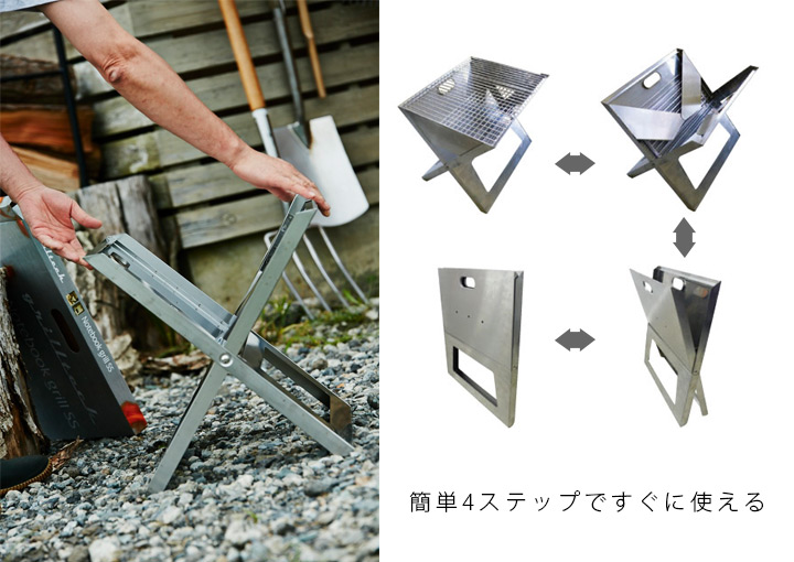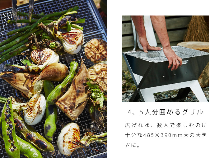 美しい外見だけでなく折り畳みの状態から展開するまで4ステップで済み、網は3つ折り式で、調理中でも網の片側を持ち上げれば炭の追加ができるなど、デザインだけでなく使い勝手にも優れています。
