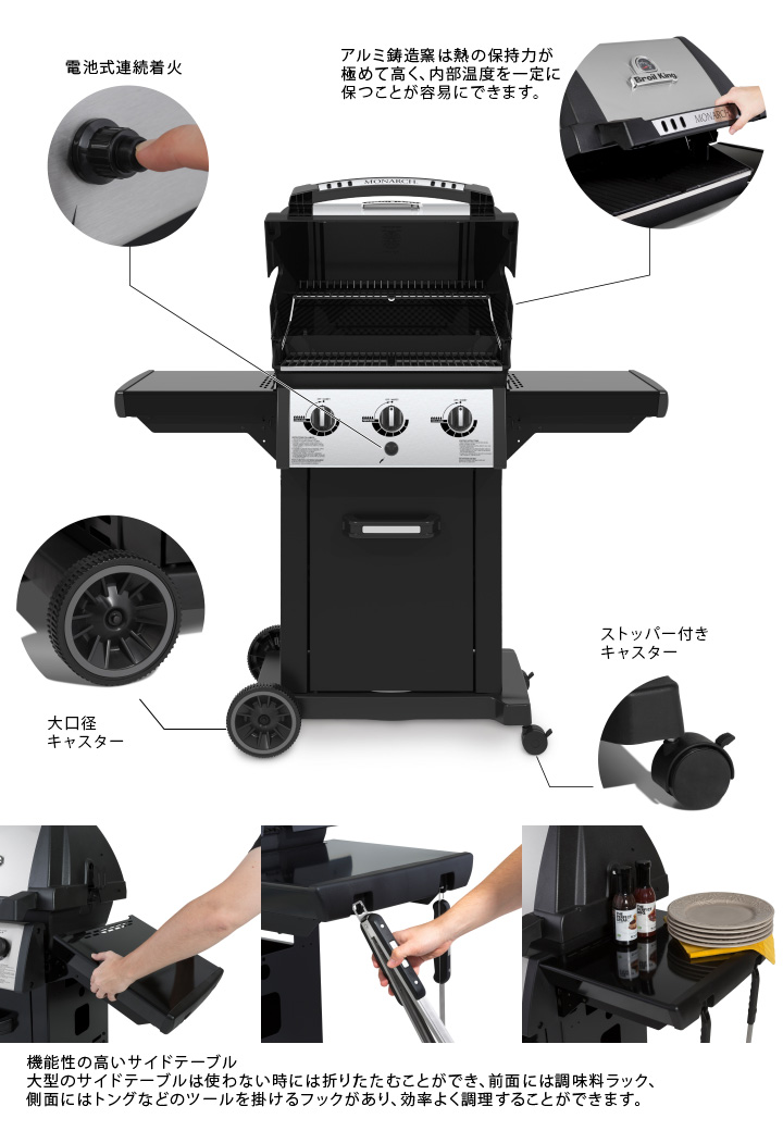 エントリーモデルとはいえ、モナーク320は3本のメインバーナーを備えた高機能仕様。