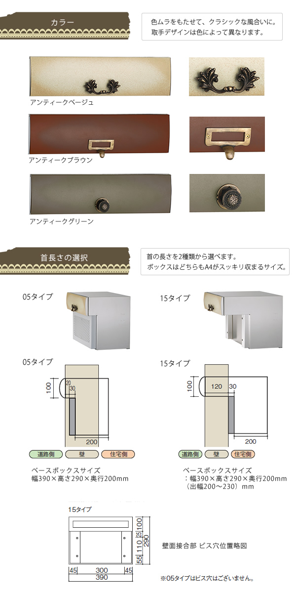 ・首の長さを2種類から選べます。住宅側の出幅を最小限にした05タイプと、施工性を考慮した15タイプをご用意。選択肢欄にてご指定下さい。サイズ05/サイズ15