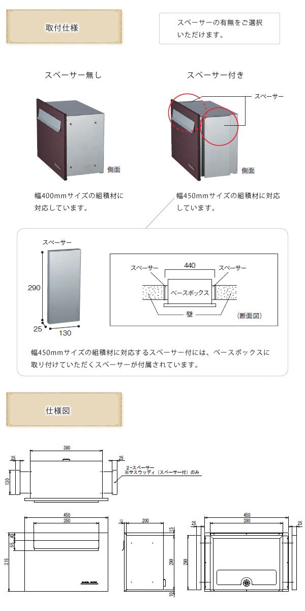 スペーサー付きは幅450mmサイズの組積材に対応。