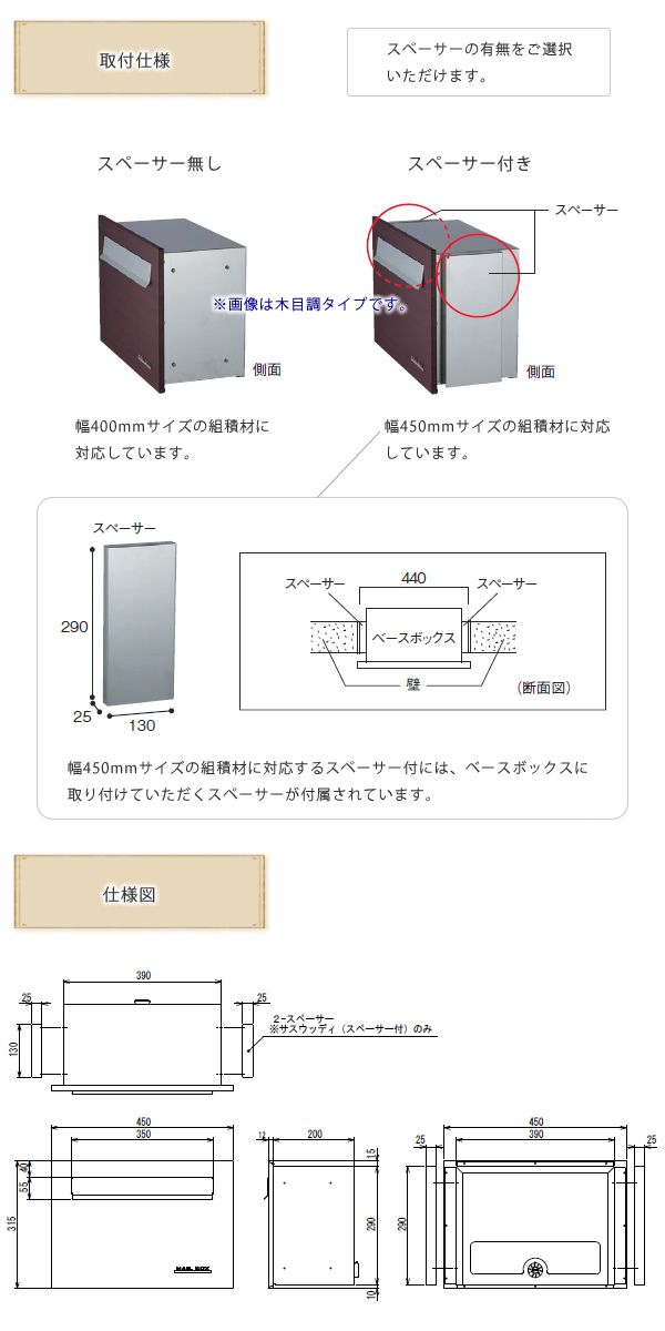 スペーサー付きは幅450mmサイズの組積材に対応。