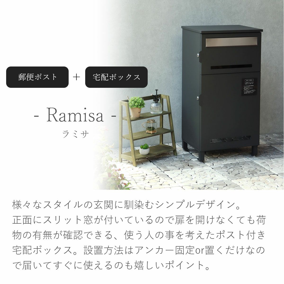 正面にスリット窓が付いているので扉を開けなくても荷物の有無が確認できる、使う人の事を考えたポスト付き宅配ボックス。