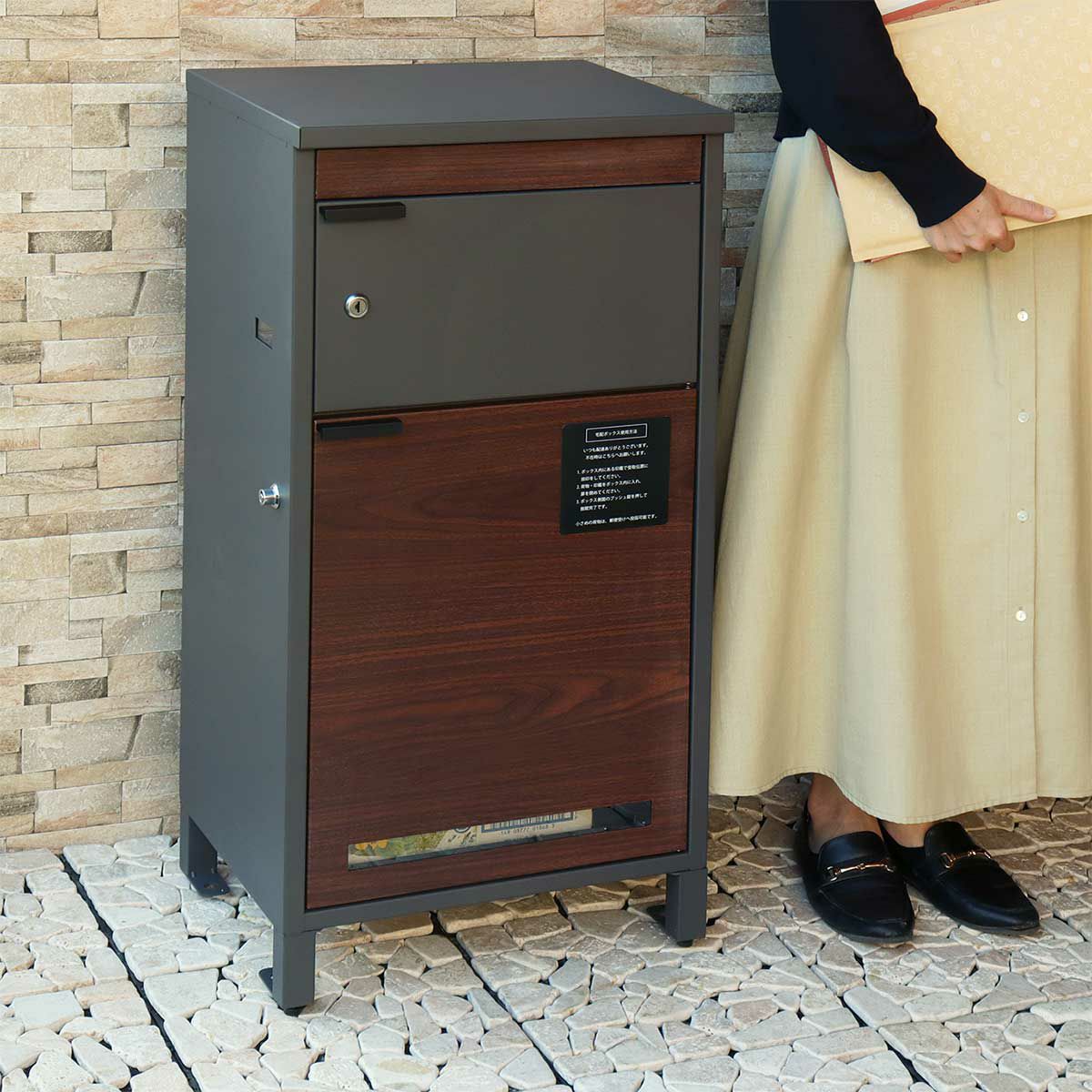 付属品:キー(上段用、下段用)、アンカーボルト、キーフック付印鑑ケース×2、宅配業者用の配達マニュアル(マグネット式)