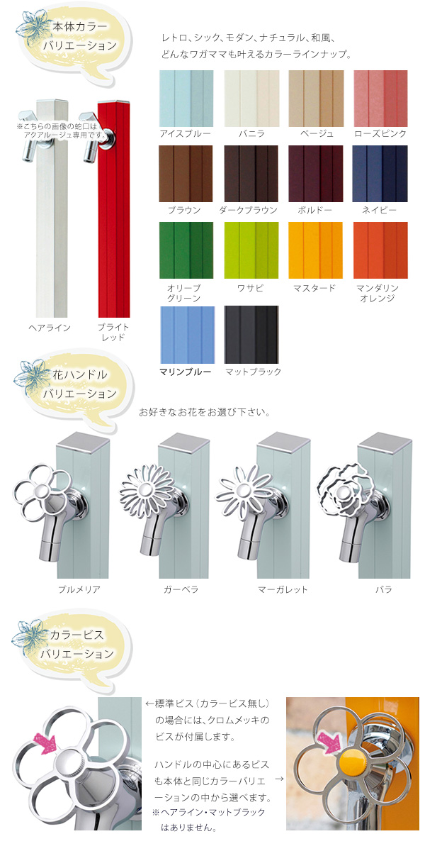 素材:カラー本体/アルミ(焼付塗装)、ヘアライン/ステンレス、立ち上がり管:ステンレス
