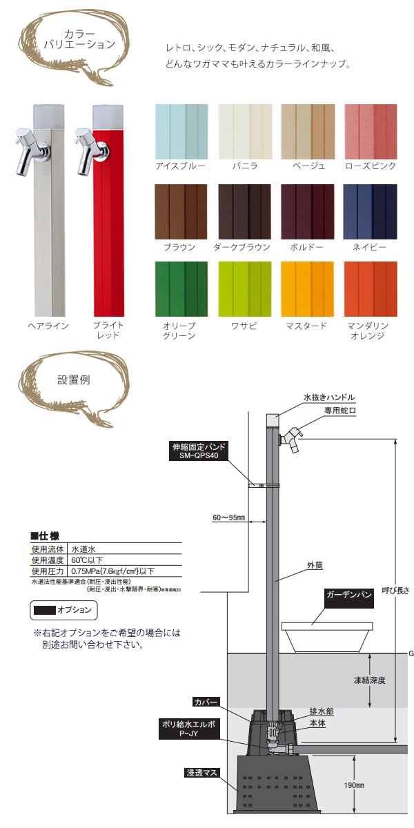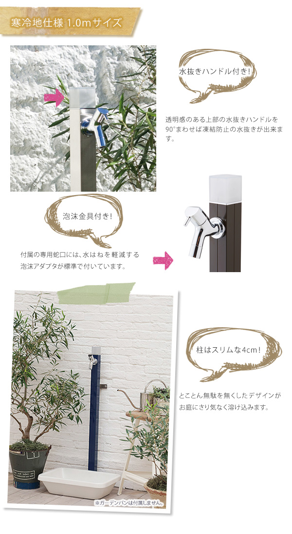 寒冷地対応のシンプルデザインの水栓柱。 細いボディは狭小スペースにもおすすめです。