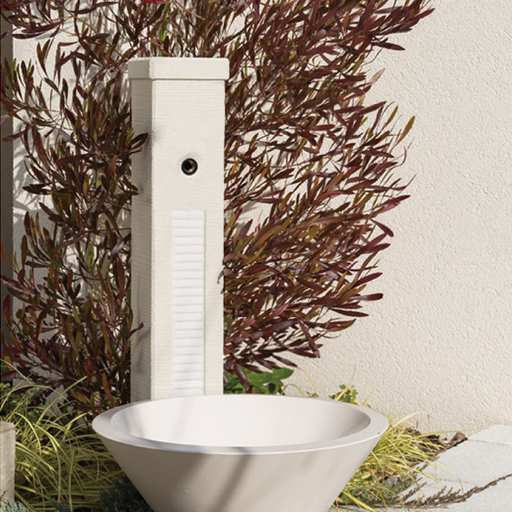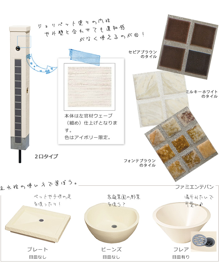 アクセントタイルと蛇口の組み合わせ次第で幅広い住宅スタイルに合うナチュラルな立水栓ファミエンテです。南欧風にもモダンスタイルにも選べるデザイン!潤いと美しさを添える、モダンな佇まい。アクセントタイルが可愛く、住まいや外構エクステリアに合わせてチョイスできます。本体は、複層左官材ウェーブ(細め)仕上げで、一般的なジョリパット (ジョリパッド)塗りの門柱や家の外壁とも違和感なく合わせることができ、統一感を演出できます。