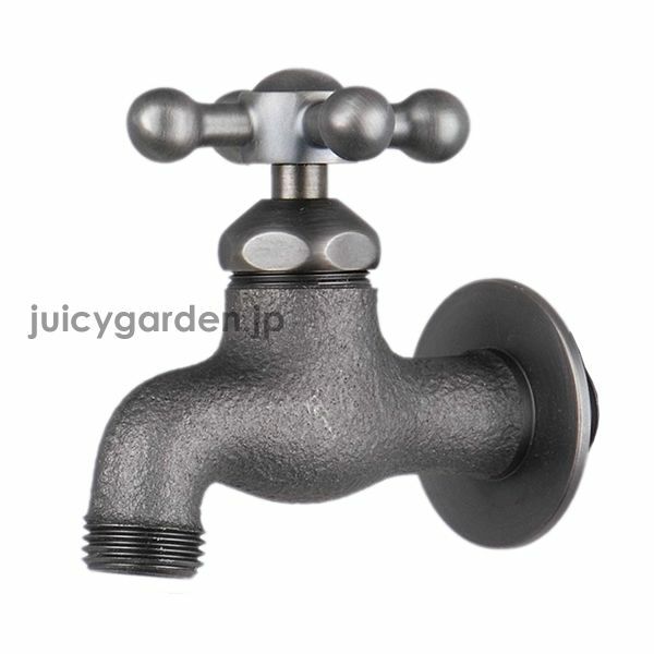 小さなお子様でも握りやすい形状の十字ハンドルは使いやすさ抜群です。クロムは落ち着いた黒っぽいカラー。和風のお庭にもオススメ。立水栓 水道 水周りに。