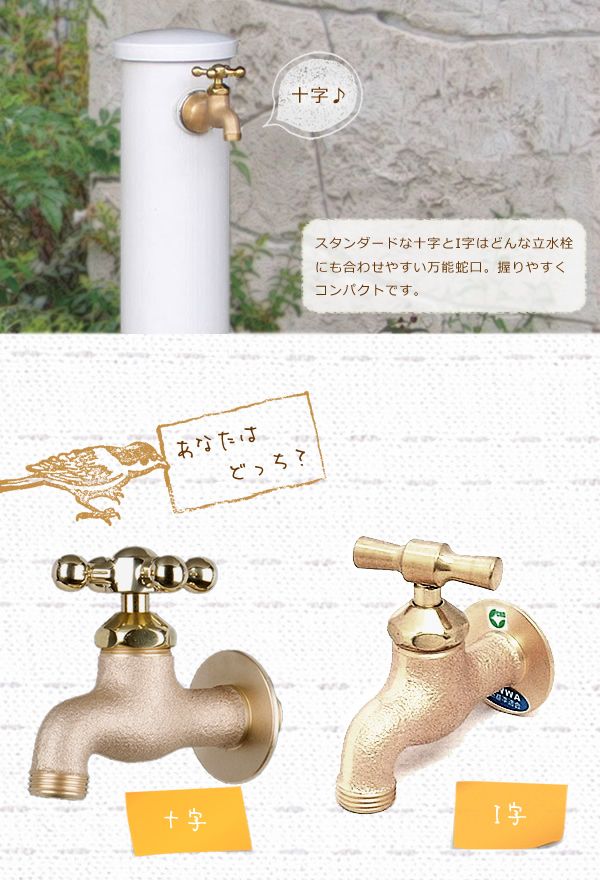 庭用の蛇口と言えば、コレ。シンプルな十字とI字は持ちやすく、立水栓に合わせやすい!小さなお子様でも握りやすい形状の十字ハンドルは使いやすさ抜群です。