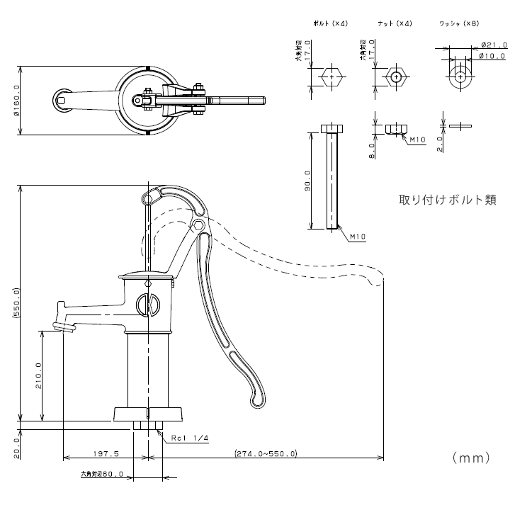設 置:打ち込み式井戸の場合/鋼管ネジ接続、堀井戸の場合/台板にボルト固定し塩ビ管接続