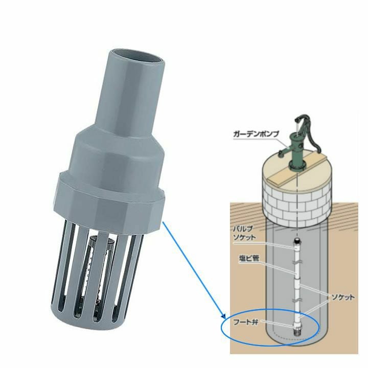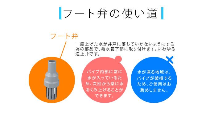 フート弁が無くても、手押しポンプは使えますが、水面から地上まで吸い上げるのがかなり大変です。ポンプの上から水を入れる呼び水が必要になる時もあります。フート弁があると呼び水が不要になるので、かなり楽になりますよ。
