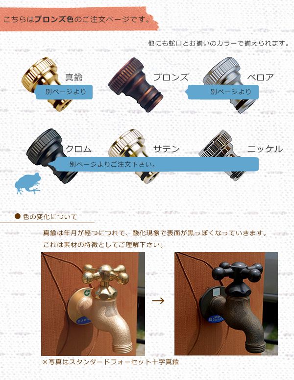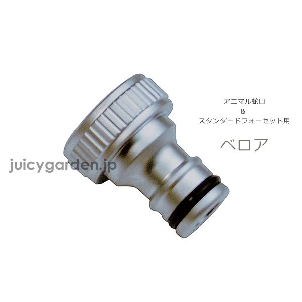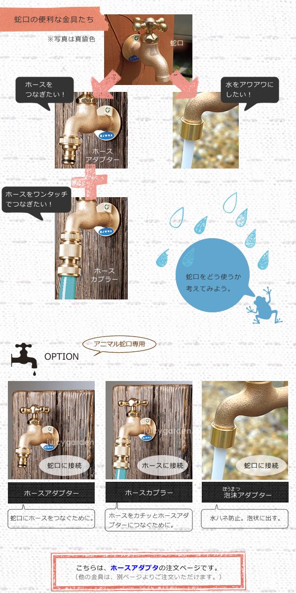 アニマル蛇口専用のホース接続アダプターです。 蛇口側にネジを回して接続します。 ニップルと呼ぶこともあります。 「ホースをつないで洗車したい」 「大切なお庭の植物たちに水遣りしたい」 「ペットを洗いたい」 ホースをつなぐといろんなことができますよね♪ お気に入りの蛇口には、専用のホースアダプターをお揃いでつけて、見た目も素敵! ホースアダプターは蛇口側につけますが、 ホース側にはホースカプラーをつけると、ワンタッチでホースが取付できるので、スタッフのお薦めです。 (ホースカプラーは別ページよりご注文いただけます。) ※使用するにつれて落ち着いた色に変わってきます。 ※下記表の【アニマル蛇口】【スタンダード蛇口】【キー付き蛇口】シリーズ専用です。単品で購入される場合には、お持ちの蛇口を事前によくご確認をお願い致します。「サイズが合わなかった」という理由でのご返品は承ることが出来ません。十分なご確認をお願い致します。※適合するかわからない場合には、お写真をお送りいただき、遠慮なくお尋ねください。