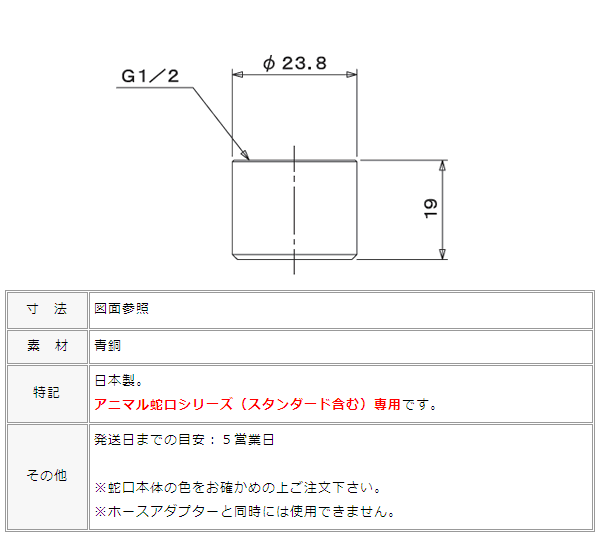 アニマル蛇口専用の泡沫アダプターです。 蛇口側にネジを回して接続します。 「立水栓が高い位置にあるから、水があちこちに飛び散る!」 「キッチンのように、アワアワの水にしたい」 「子供の手洗いにも優しく使えるように」 こんな時に便利なのが、泡沫アダプターです♪ ホース接続アダプターとは一緒に使えないので、どちらか選ばなければいけませんが、ホースを使わない蛇口には是非取り付けて欲しいのが、スタッフの本音。 ネジで回すだけなので、ホースアダプターと泡沫アダプターを取り換える事もできますよ。外した方を無くさないでね。 ※真鍮は使用するにつれて落ち着いた色に変わってきます。 ※下記表の【アニマル蛇口】【スタンダード蛇口】【キー付き蛇口】シリーズ専用です。単品で購入される場合には、お持ちの蛇口を事前によくご確認をお願い致します。「サイズが合わなかった」という理由でのご返品は承ることが出来ません。十分なご確認をお願い致します。※適合するかわからない場合には、お写真をお送りいただき、遠慮なくお尋ねください。