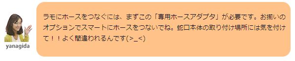 ホース側にはホースカプラーをつけると、ワンタッチでホースが取付できるので、スタッフのお薦めです。