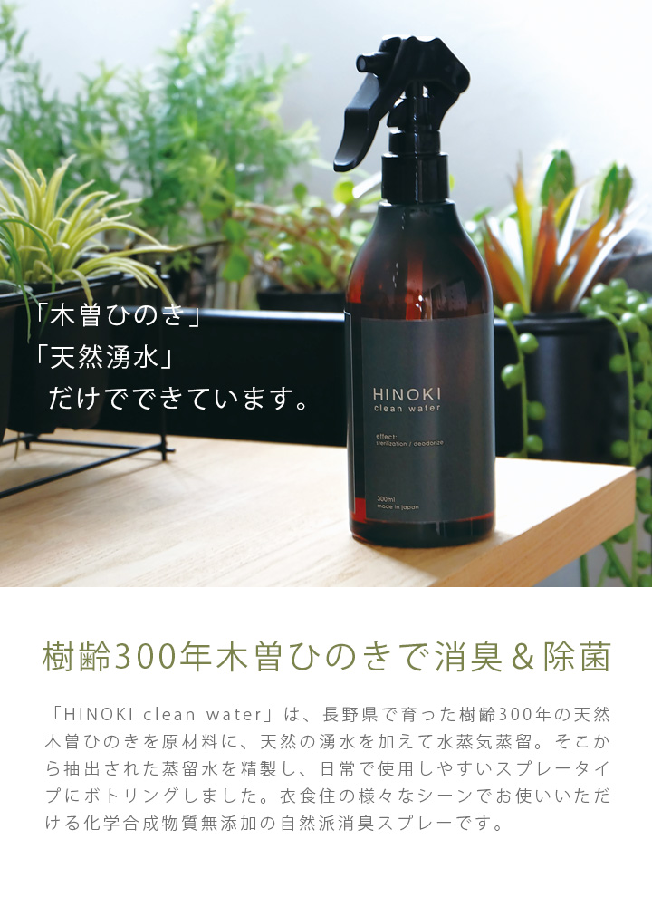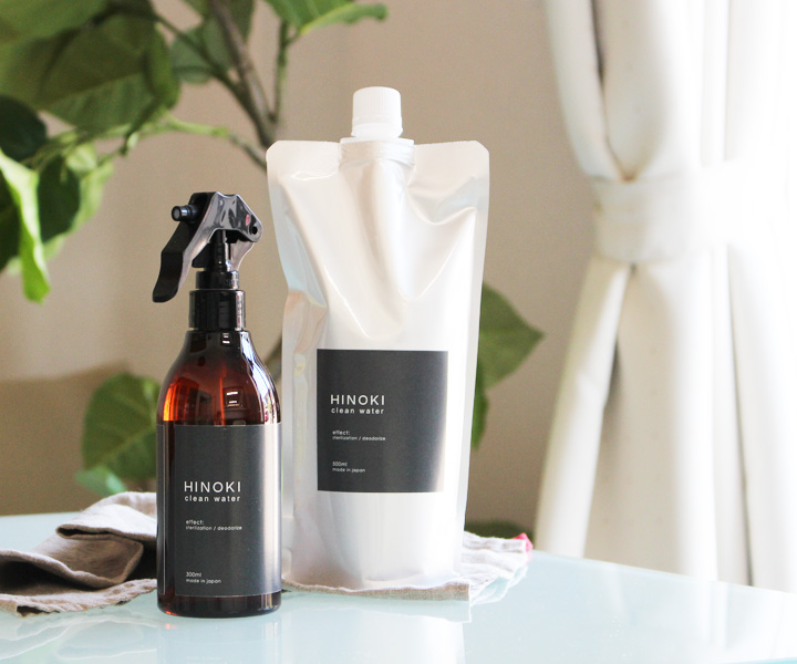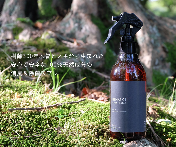 「HINOKI clean water(ヒノキ クリーンウォーター)」は木曽ヒノキから生まれた、安心で安全な100%天然成分の除菌・消臭スプレーです。
