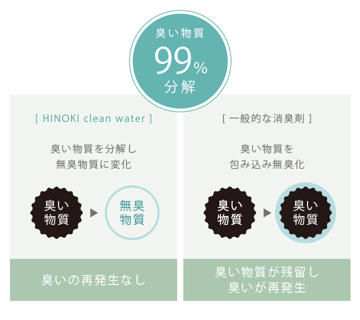 一般的な消臭剤は臭い物質をコーティングするのみで時間が経つにつれ効果が薄れニオイが再発生するのに対し、「HINOKI clean water」は臭い物質を無臭物質に変化させるためニオイの再発生はありません。ゴミ臭や足の裏・加齢臭をはじめとする体臭(イソ吉草酸)、ペットのニオイなど幅広い悪臭の元を99%分解します。