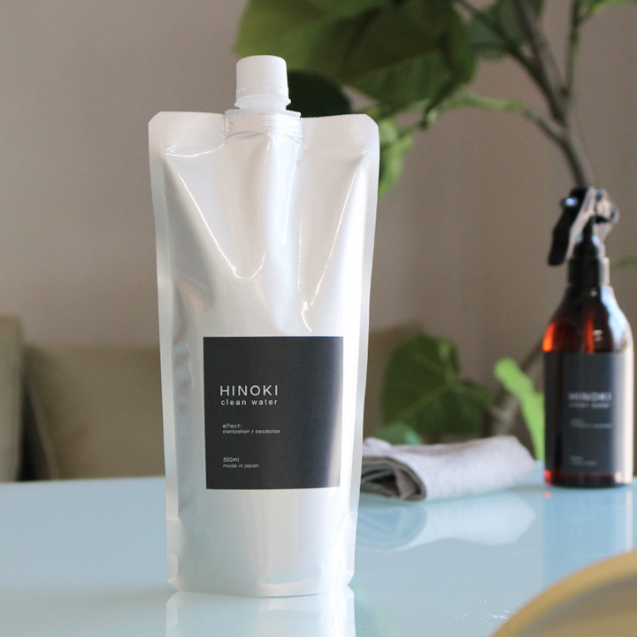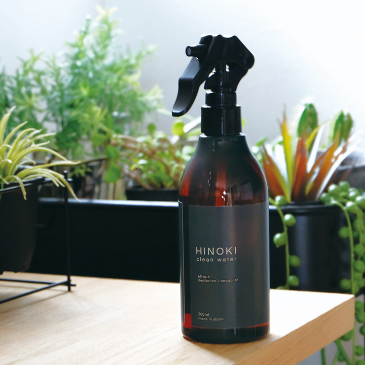 「HINOKI clean water」は、長野県で育った樹齢300年の天然木曽ひのきを原材料に、天然の湧水を加えて水蒸気蒸留。そこから抽出された蒸留水を精製し、日常で使用しやすいスプレータイプにボトリングしました。衣食住の様々なシーンでお使いいただける化学合成物質無添加の自然派消臭スプレーです。