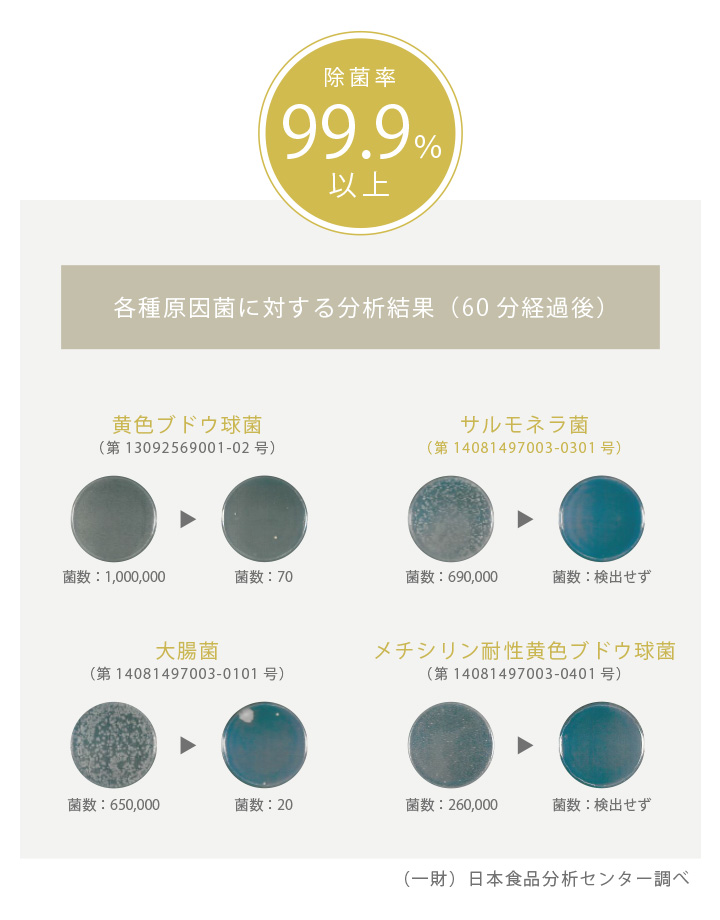 食中毒の原因菌である「黄色ブドウ球菌」や「サルモネラ菌」「大腸菌」、また院内感染症の原因とされる「メチシリン耐性黄色ブドウ球菌」などの除菌率99.9%以上とする分析結果が得られています。