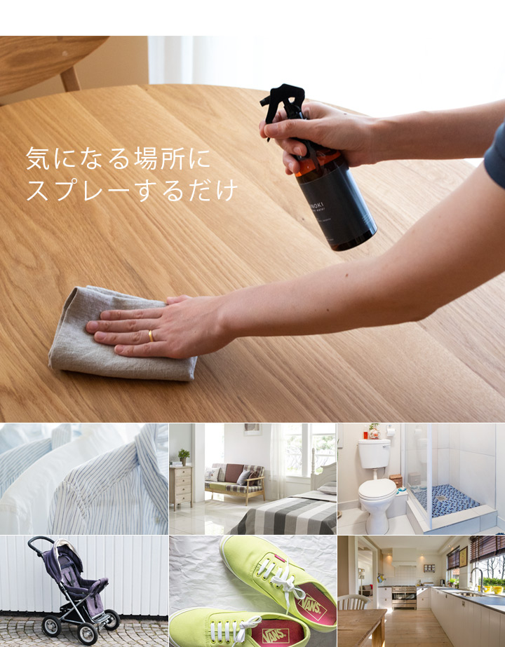 使用シーン:衣類、クローゼット、ベッドシーツ、タオルケット、カーテン、ラグ・カーペット、その他ファブリック、キッチン周り、まな板、キッチンクロス、リビング、ダイニング、サニタリー、トイレ、バス、靴、下駄箱、ベビーカー、おもちゃ、ペット用品、車のシート、アウトドア用品等…様々なシーンで消臭・除菌が行えます。