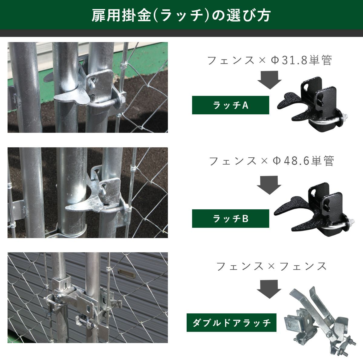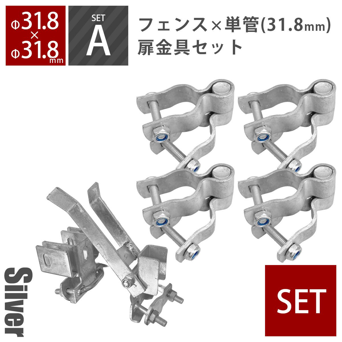 フェンスおしゃれ かっこいい パーティション ガレージ DIY 金網 柵 かんぬき 掛け金 ガルバナイズド 男前 西海岸 フェンス 「 アメリカンフェンス 扉金具セットA(Φ31.8mm用) シルバー ( ヒンジA2個+ラッチA1個) 」