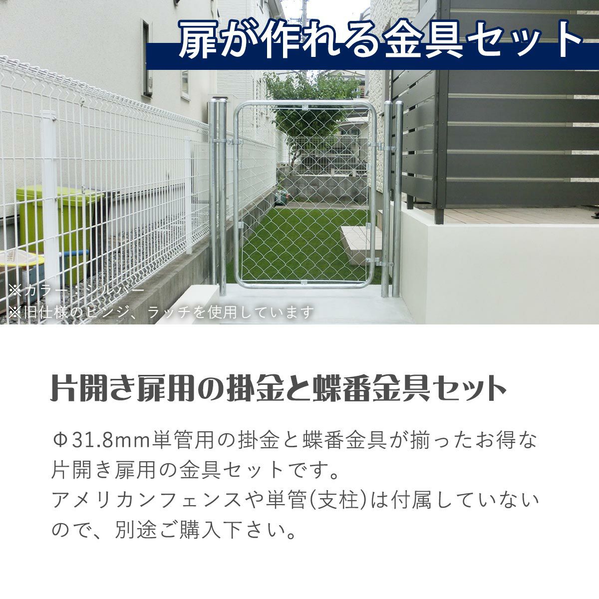 片開きのフェンス扉を作成するための掛金1個と蝶番2個を組合わせたアメリカンフェンス専用の金具セットです。