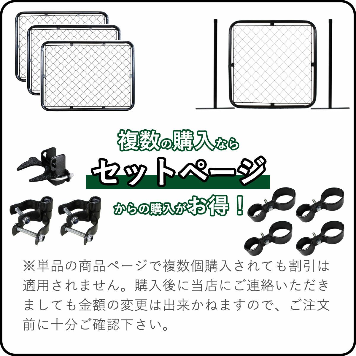 ペットの進入を防ぐパーテーションを構成する組合せは、フェンス、支柱(ポストスタンド)、フェンスと支柱を連結する金具(ジョイントA)が一般的です。こちらの一例ではフェンスMサイズを使用した高さ900mmの幅約1310mmの多くの方に採用された組合せをご紹介。ご希望のカラーを以下で選択いただくと、これらが構成されたセットか、これらの構成に必要な一覧に移動します。