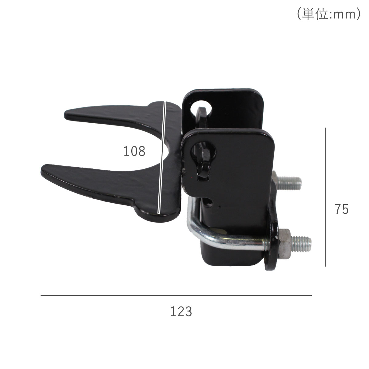 ラッチをフェンスに取り付け、直径48.6mmの支柱を挟み込むように掛金を下ろすだけで扉の固定が出来る簡単仕様で、南京錠でロックすれば掛金を固定することも可能です。