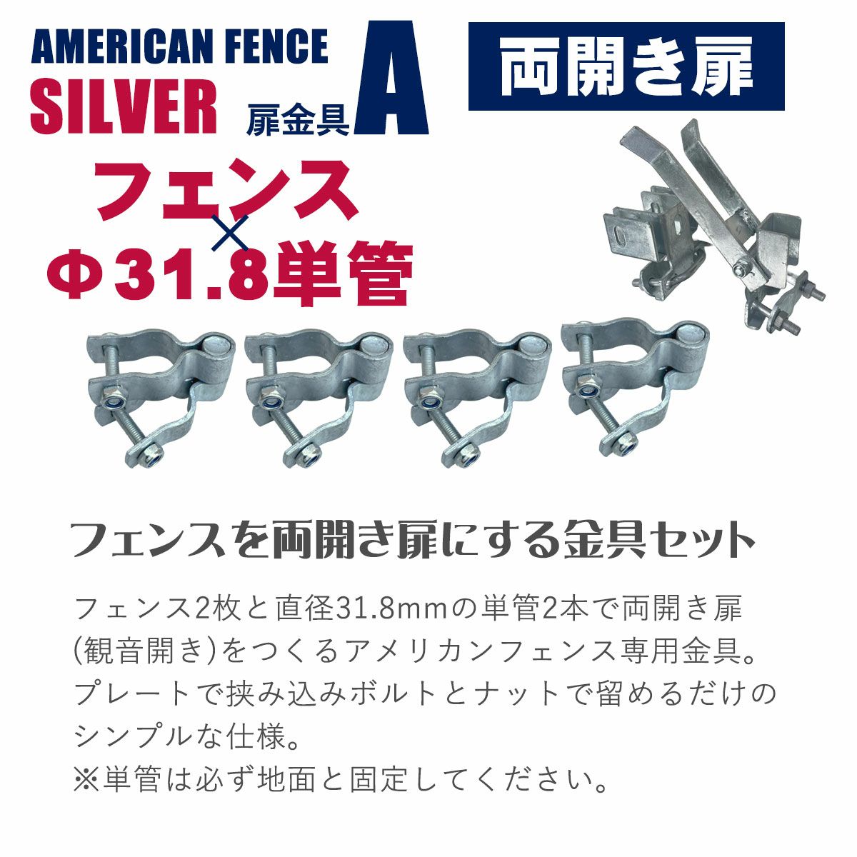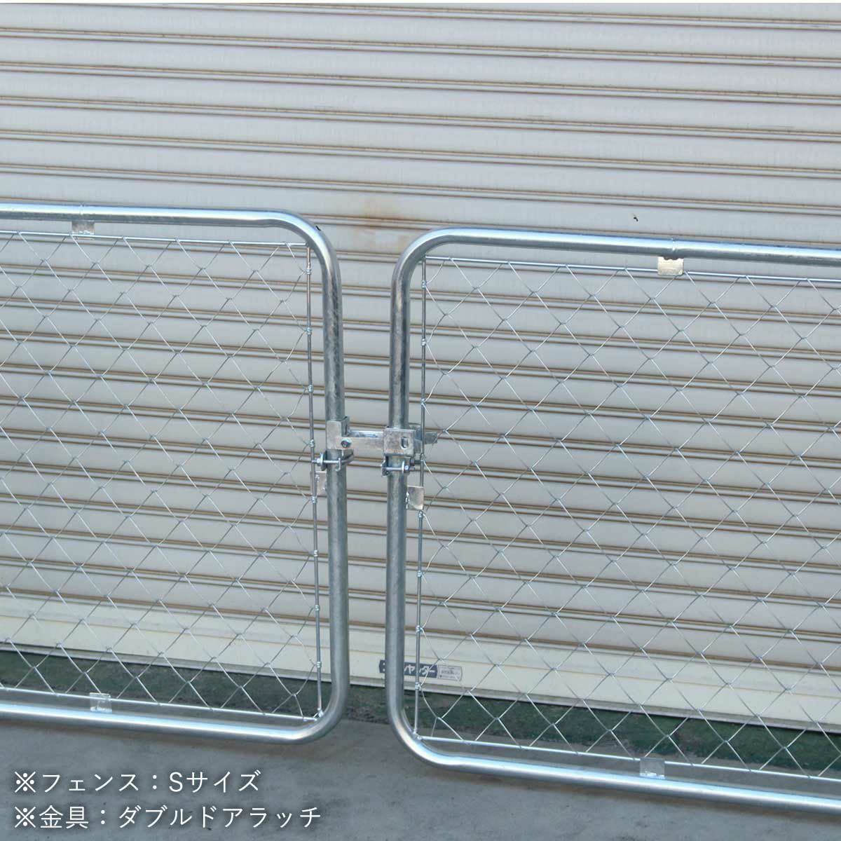 メッシュフェンス DIY 金具 ドア 扉 観音開き おしゃれ 屋外 ガレージ 屋内 インテリア アメリカ 西海岸 スタイル 店舗 メタルフェンス 犬 ビンテージ パーティション 「 アメリカンフェンス 両開き扉金具セットA(Φ31.8mm用) シルバー ( ヒンジA4個+ダブルドアラッチA1個) 」