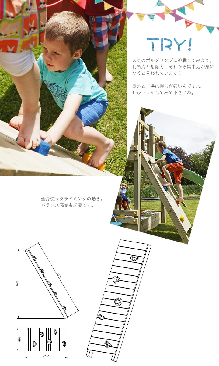 足や全身のバランス、柔軟性を使って登るので、それほど筋力が必要なわけではありません。全身のバランス、そして想像力や集中力を鍛える効果があり、子供も達成感を味わえるので人気です。