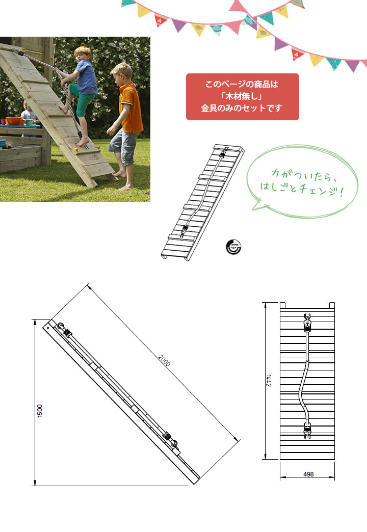 筋力・バランス力を鍛えることができます。特に腕の力、握力、背筋力。登れるようになると嬉しくて何回も登るロープ坂。力が付いたらチャレンジしてみてくださいね!