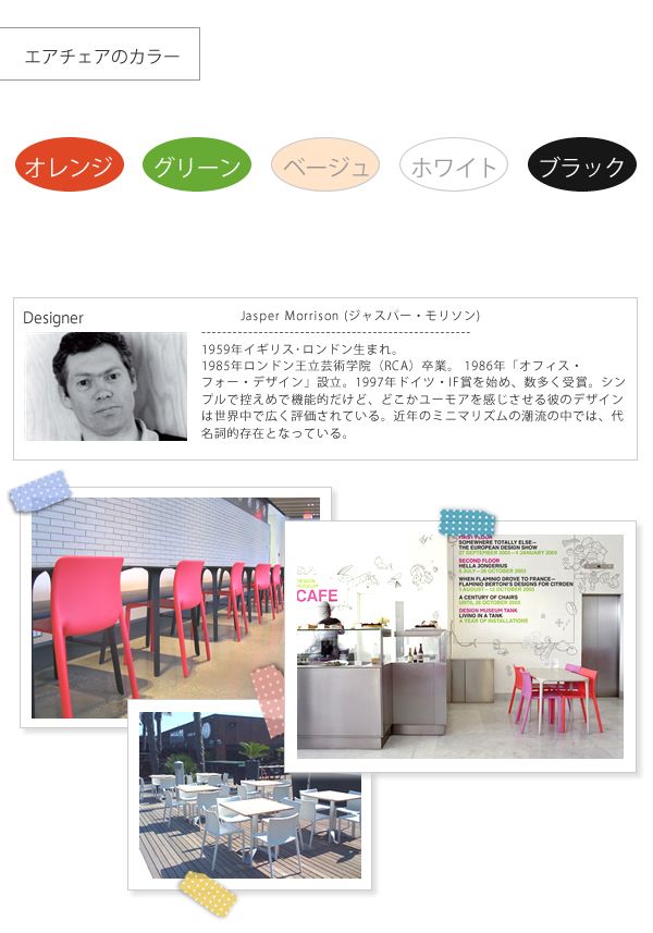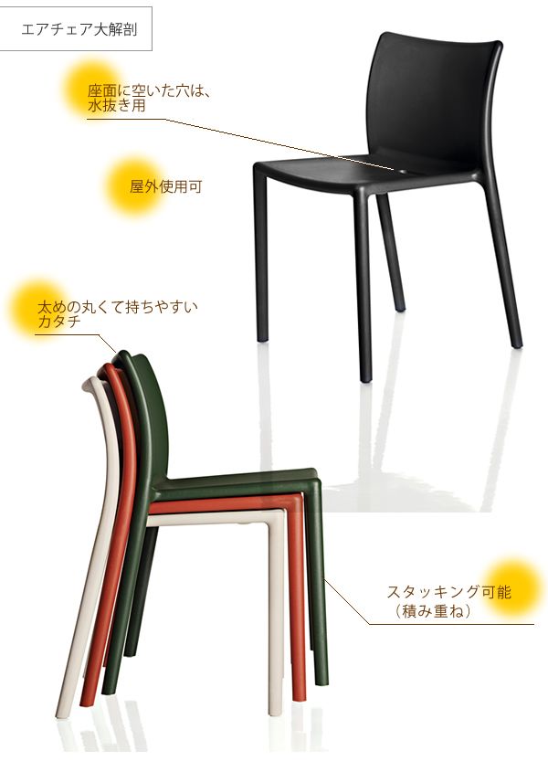 座面に空いた穴は、持ち運びやすさ、雨天時の水はけ用にと考慮されたデザイン。様々なシーンに対応するカラフルなチェアーです。
