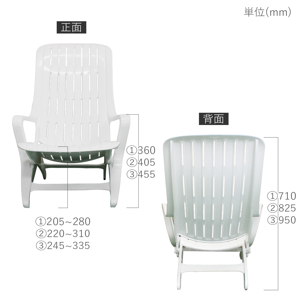 座面の高さ:①SH約205~SH約280mm・②SH約220~SH約310mm・③SH約245~SH約335mm