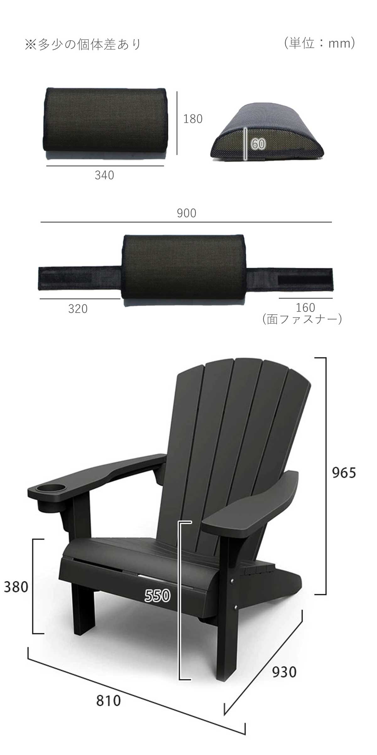 サイズ(個体差あり):クッション/W約340mm×H約180mm×D約60mm、ベルト/約W320mm、約W240mm、面ファスナー/約60mm