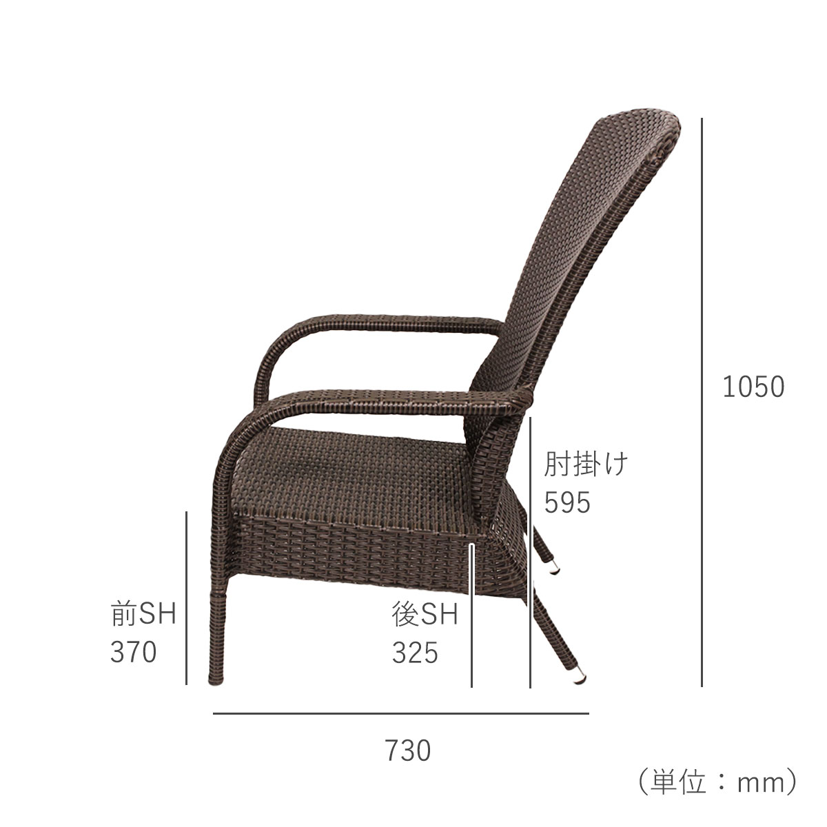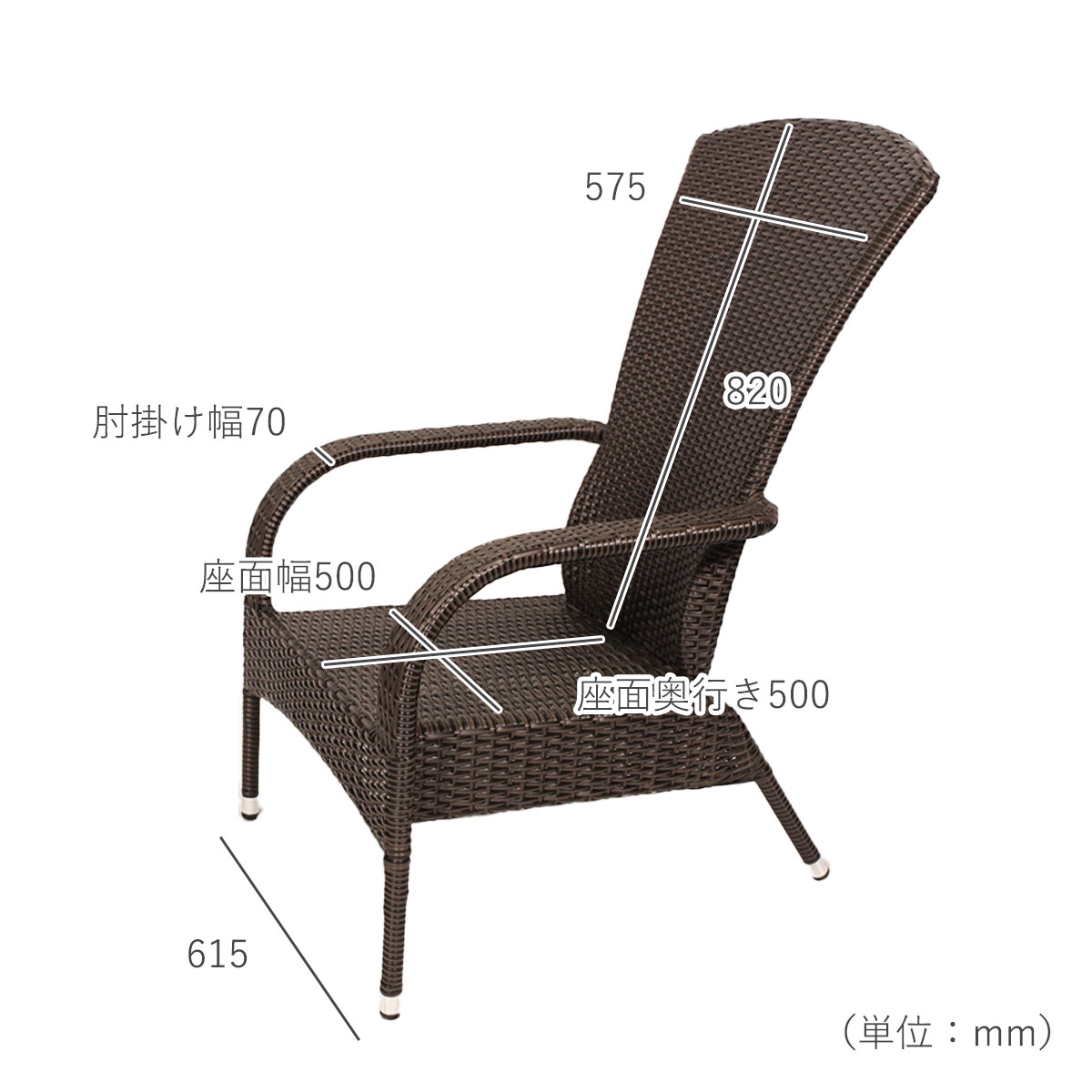 その他サイズ:前SH370mm、後SH325mm、座面幅500mm、座面奥行き500mm、背もたれの高さ820mm、背もたれの幅575mm、肘掛け高さ595mm、肘掛け幅70mm
