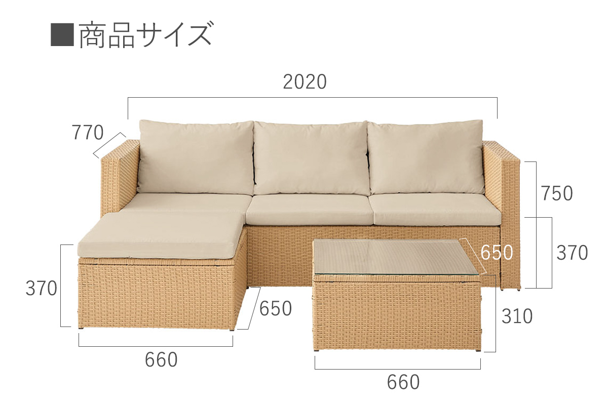 サイズ:ソファー/W2020×D770×H750×SH370mm、オットマン/W660×D650×H370mm、テーブル/W660×D650×H310mm