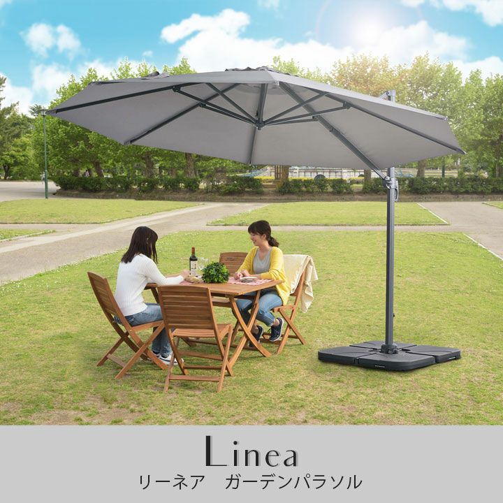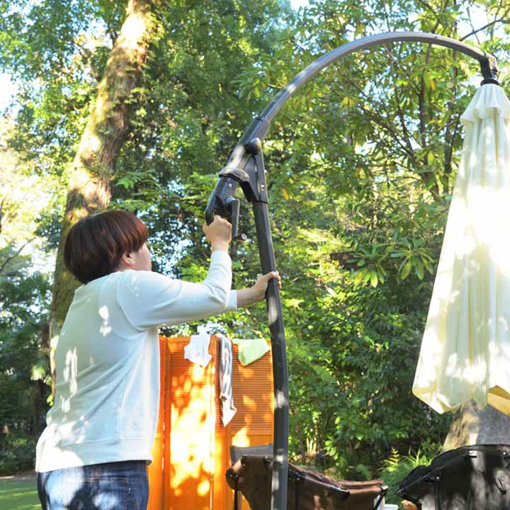 支柱が真ん中にあるパラソルタイプや、傘の部分が上から吊るされているハンギングタイプがあるので、用途に合わせてお選びください。