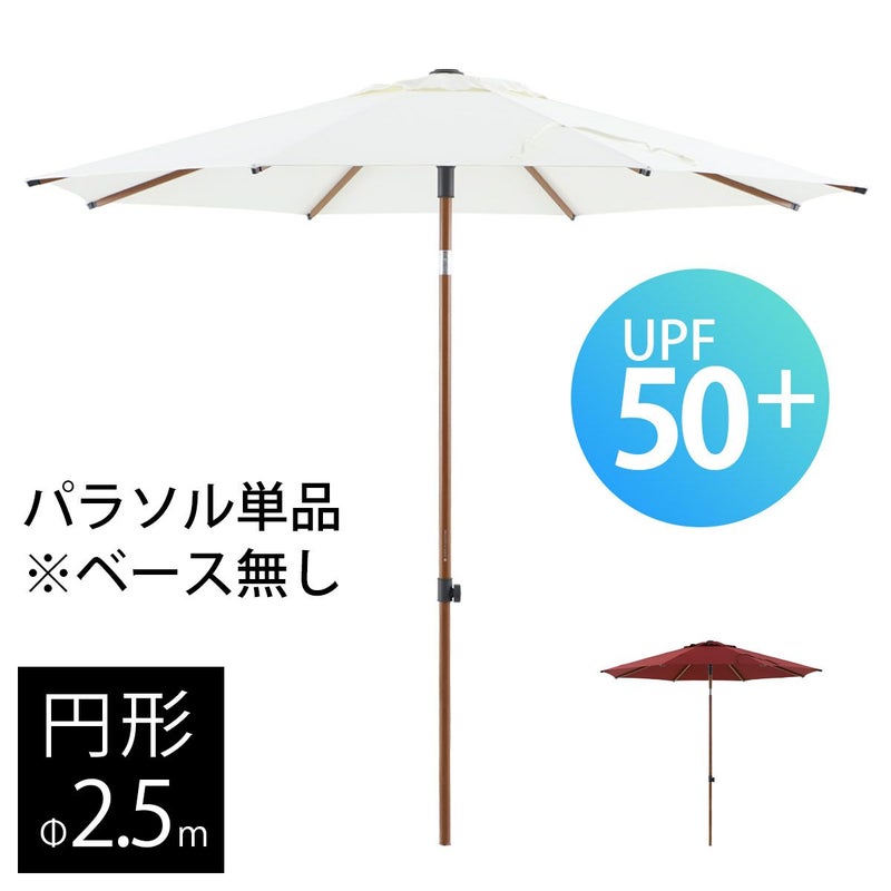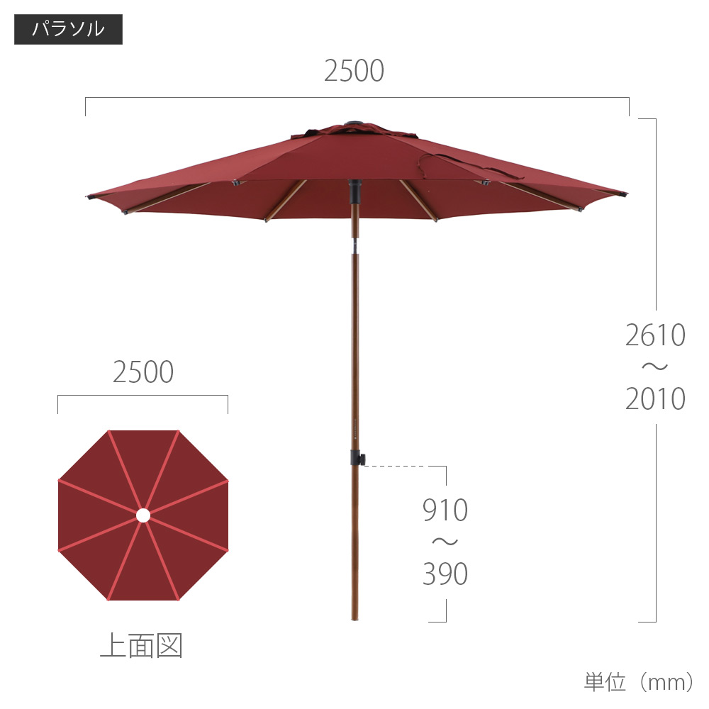 サイズ:パラソル本体(オープン時)/W約2500×D約2500×H約2010~2610mm、ポール/上部直径38mm 下部直径35mm