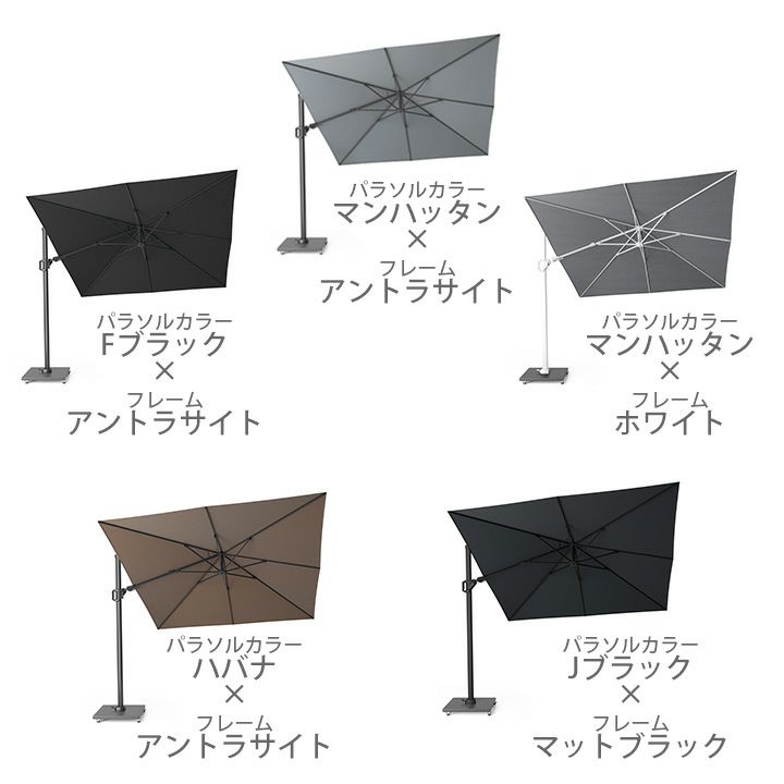 支柱が真ん中にあるパラソルタイプや、傘の部分が上から吊るされているハンギングタイプがあるので、用途に合わせてお選びください。