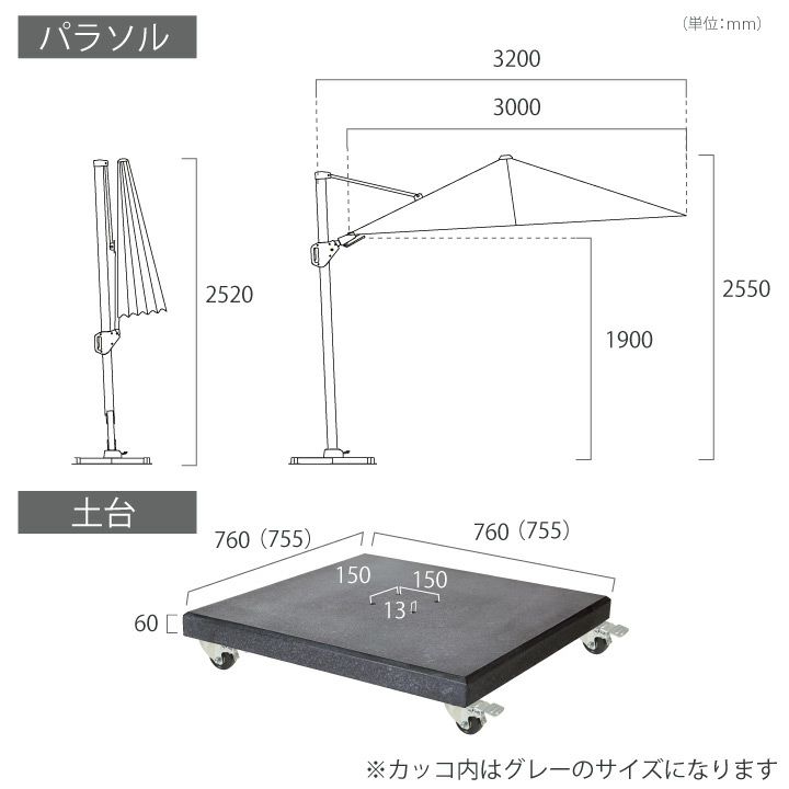 支柱が真ん中にあるパラソルタイプや、傘の部分が上から吊るされているハンギングタイプがあるので、用途に合わせてお選びください。
