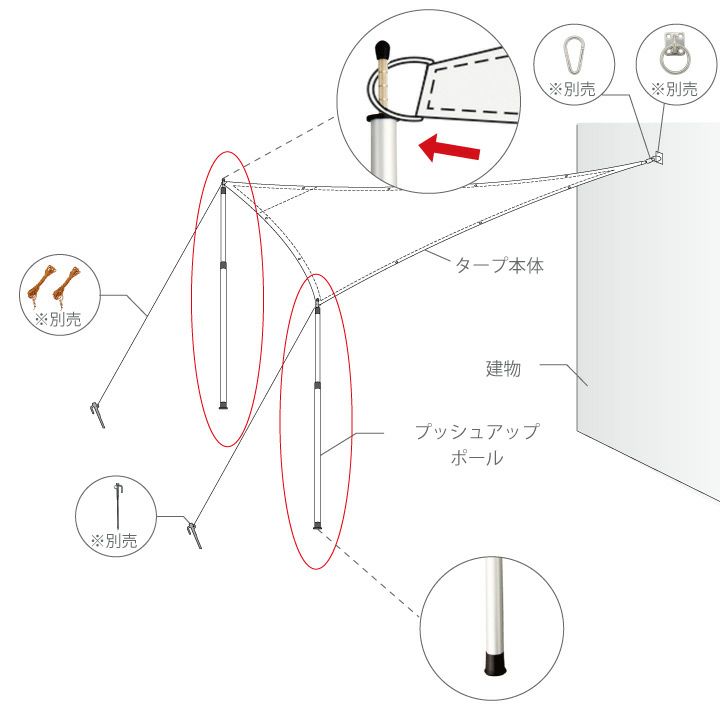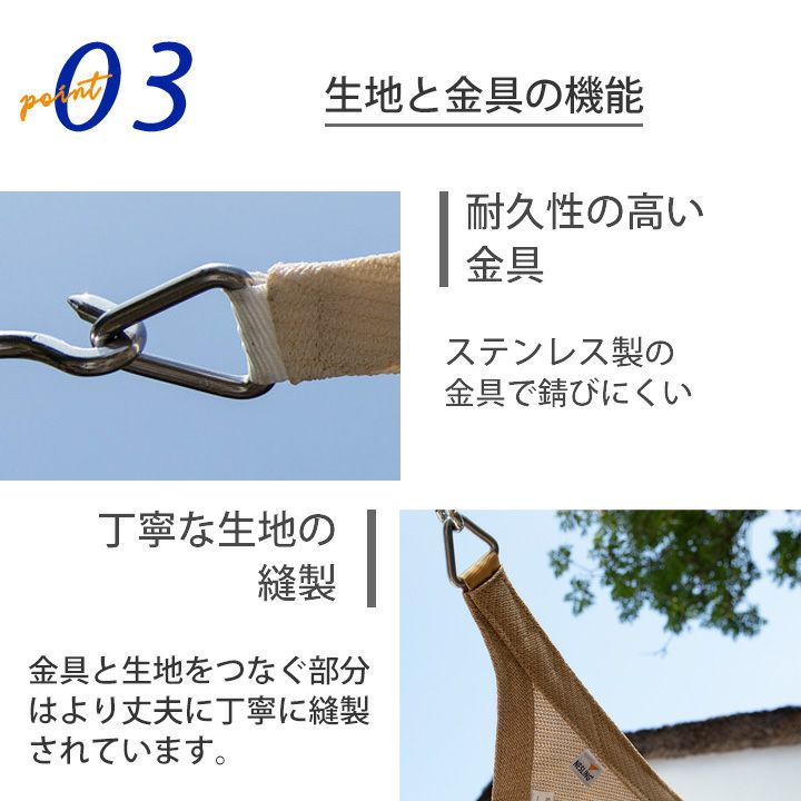 シェードセイルは専用の柱を建てたり、家の柱などを利用してタープを取付けます。