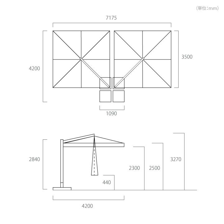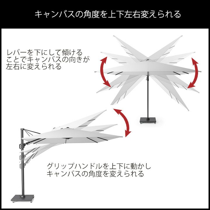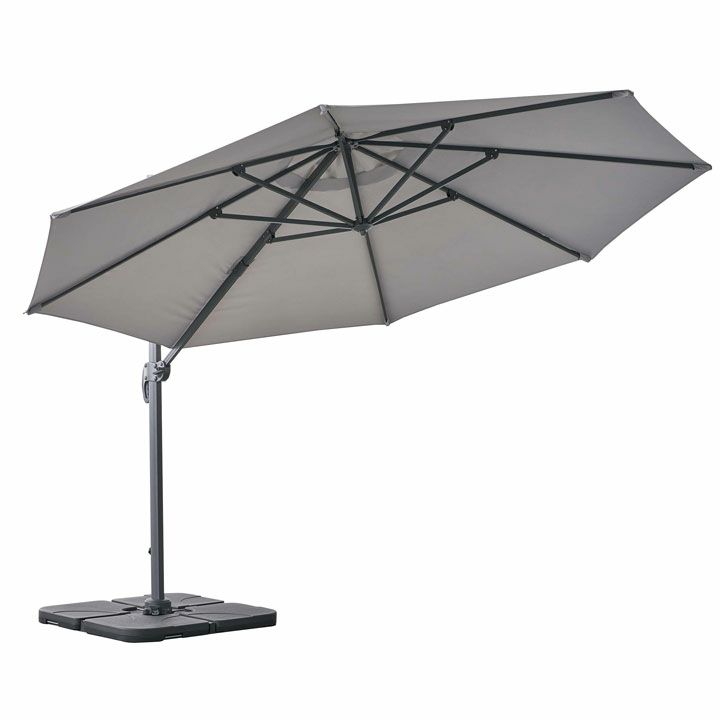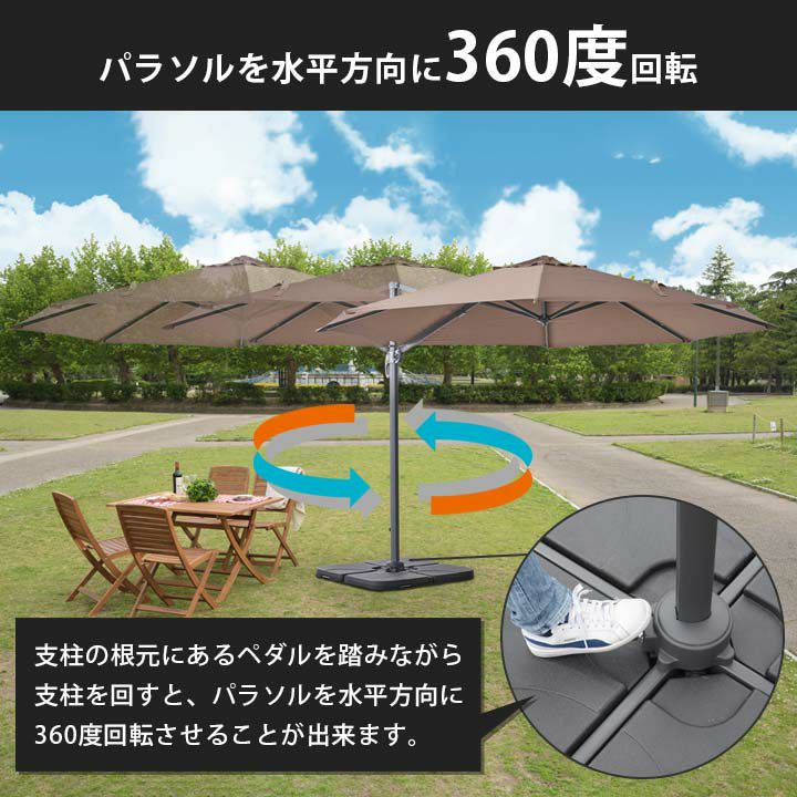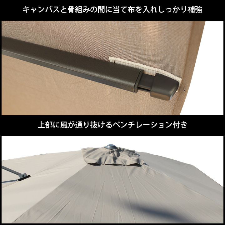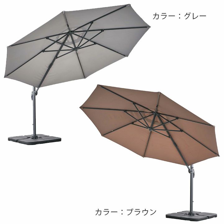 支柱が真ん中にあるパラソルタイプや、傘の部分が上から吊るされているハンギングタイプがあるので、用途に合わせてお選びください。