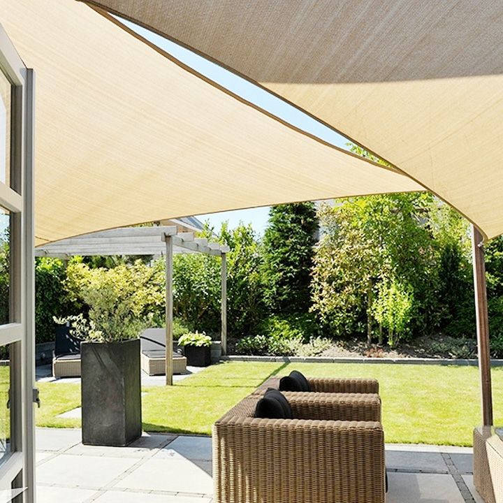 三角形や長方形のシェードを2枚組み合わせて、個性的でおしゃれにお庭をコーディネートしてみてください。