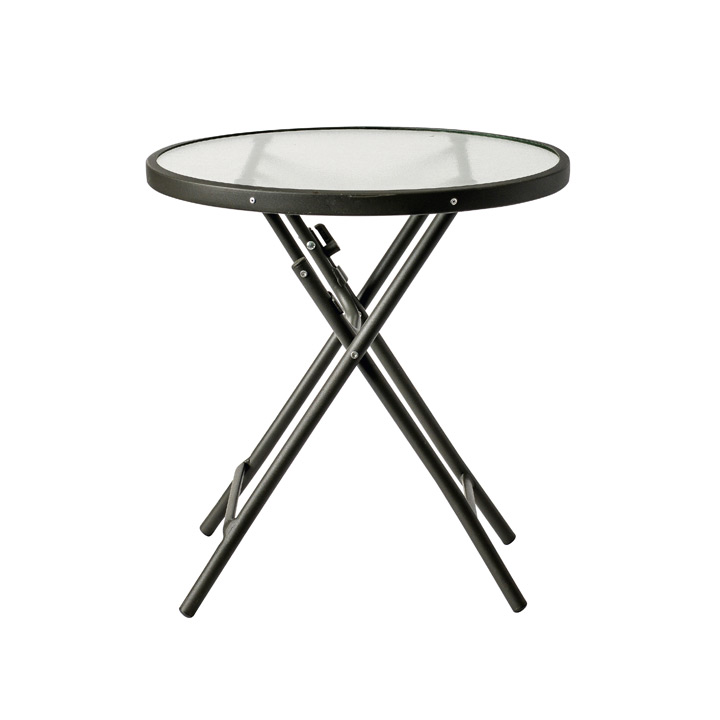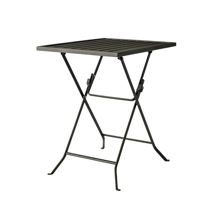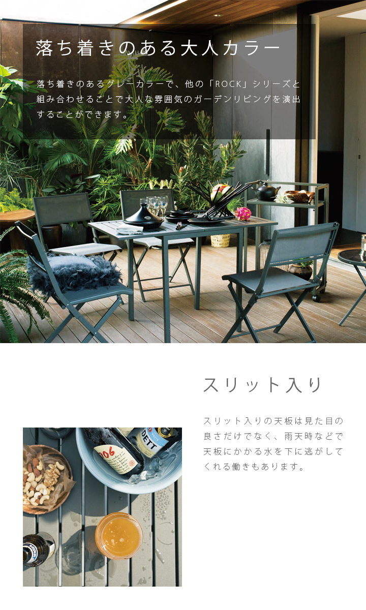 シックなグレーカラーでシンプルなフォルムが特徴の板が折り畳めるガーデンテーブルです。