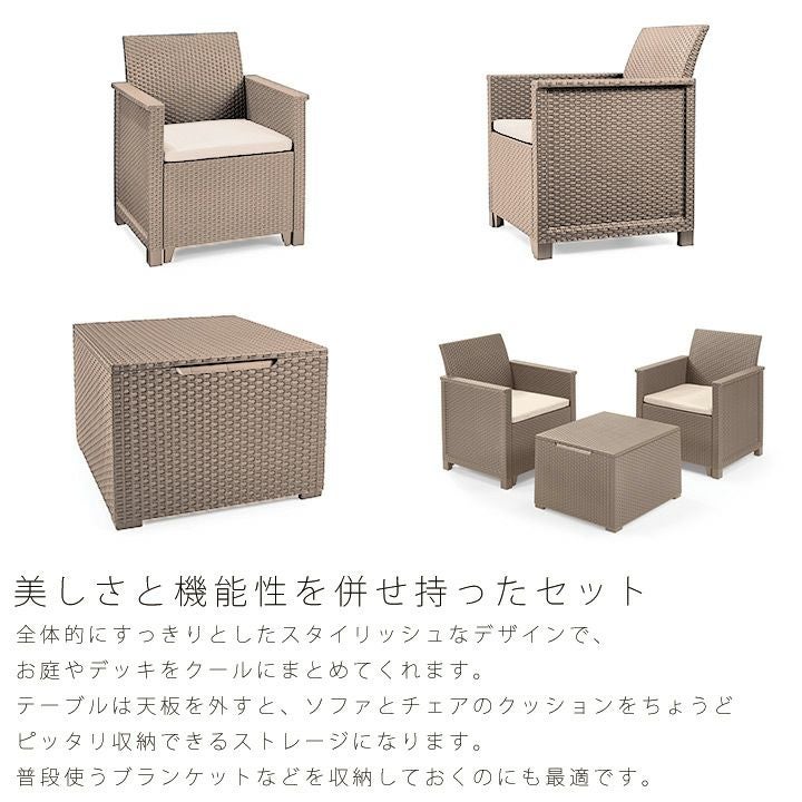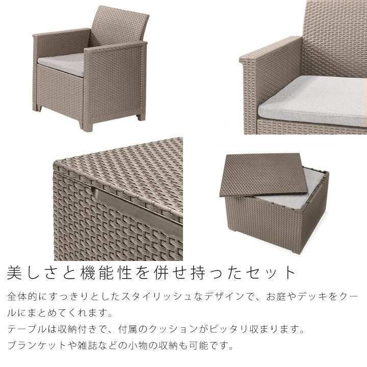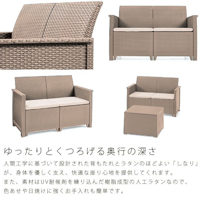 他の画像を見る Keter ケター エマ 2シート ソファ チェア テーブル ラタン 樹脂 クッション 収納 ベージュ 樹脂製ラタン調家具「ケター (KETER) エマ 2人掛けガーデンソファー&収納付きガーデンテーブル 4点セット (EMMA 2SEATER LOUNGE SET 148007)」 販売価格 ¥ 59,400 税込 在庫切れ 詳細を見る お気に入りに登録する (0)
