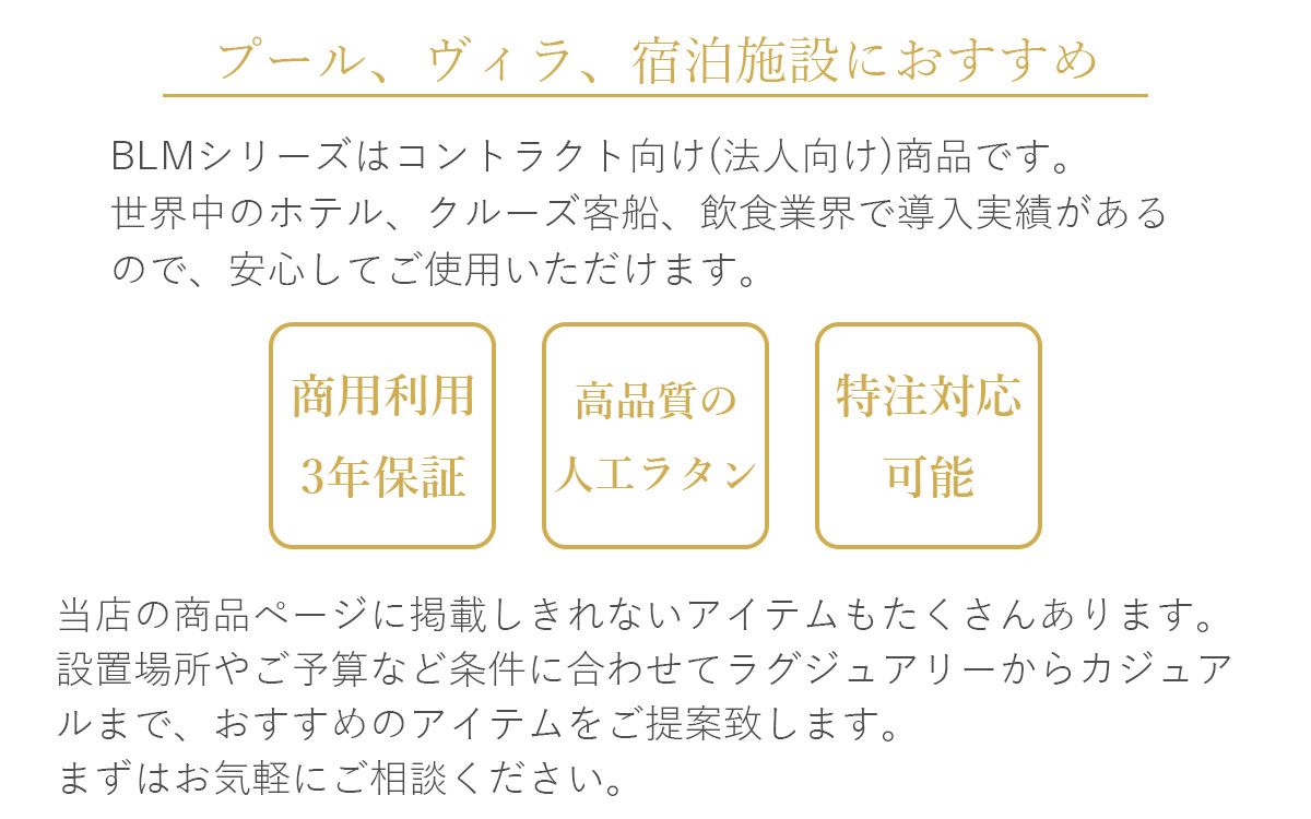 サイドテーブル「BLM-1707」と組み合わせるとプールサイドだけでなく温浴施設やテラスなど様々なシーンで活躍します。