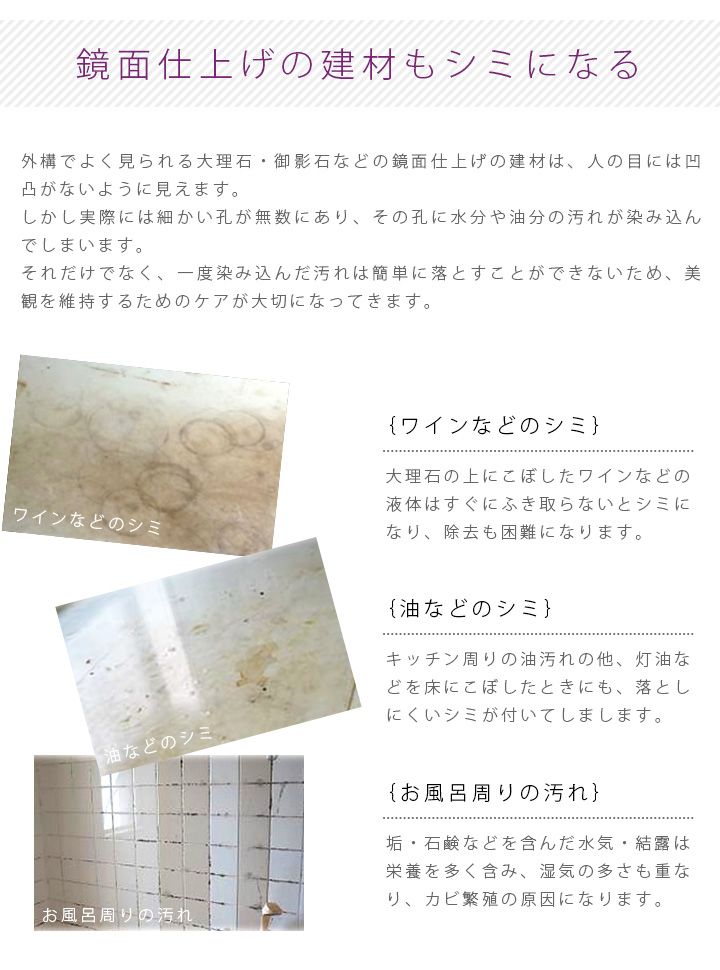 煌庭「鏡」は、大理石・御影石などの鏡面仕上げ素材専用の汚れ・シミ防止剤。