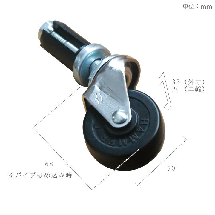 サイズ:本体/H約121×W33mm、車輪/直径約50×W約20mm、取付高(パイプはめ込み時)/H約68mm