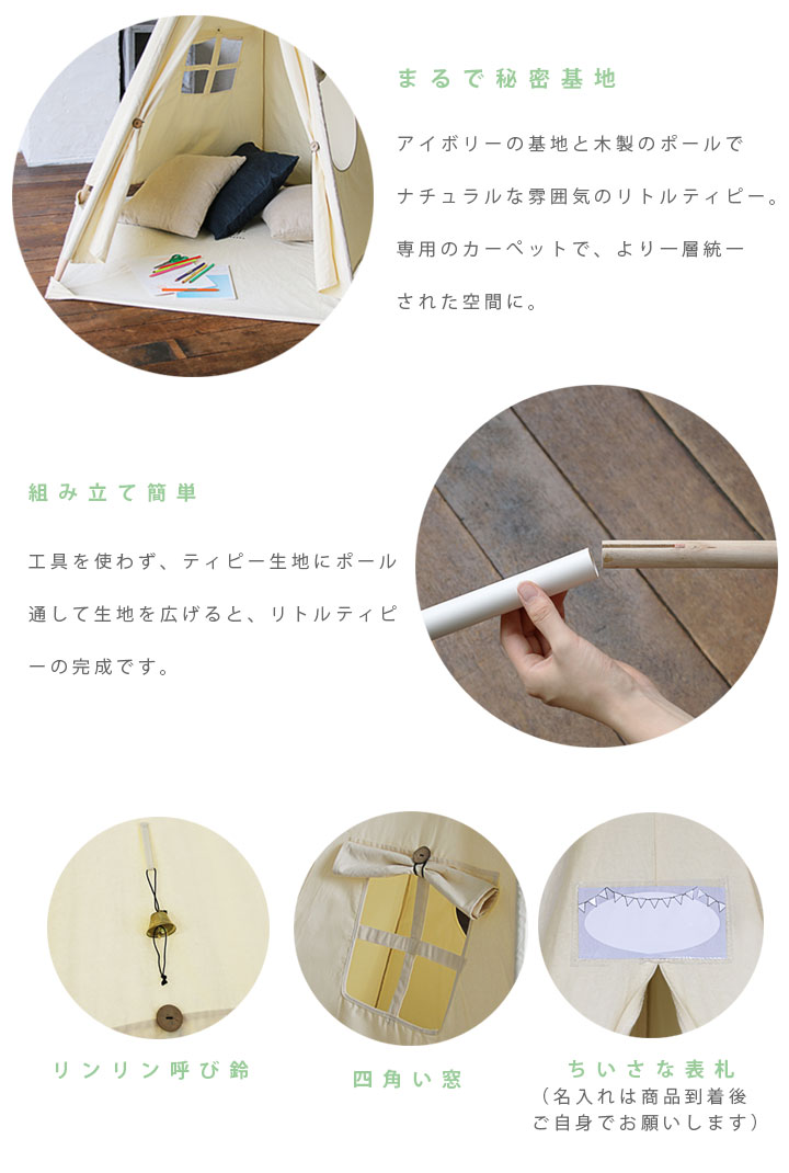 付属品:ティピー生地、カーペット生地、丸棒、ベル、収納バッグ、説明書