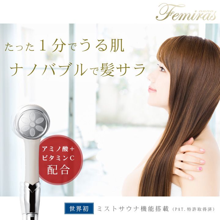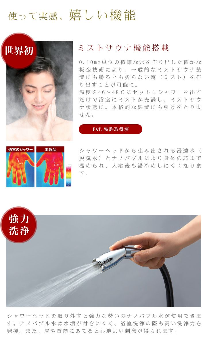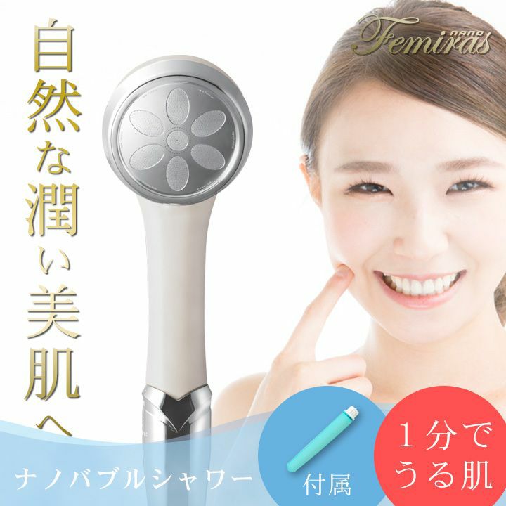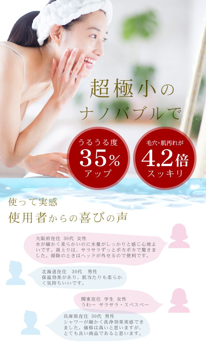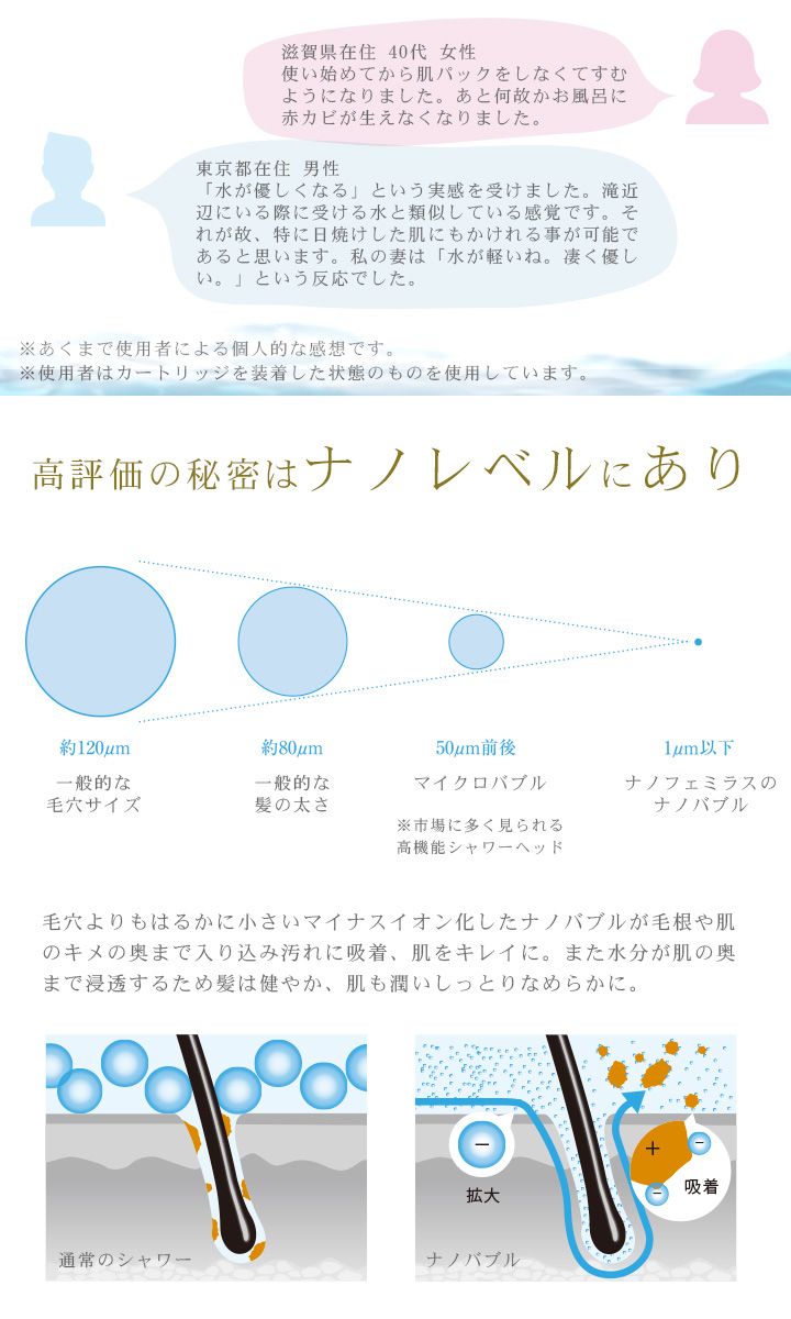 詳細:水中に含まれる空気を1.0μm以下のナノバブルにすることで水質が「カラダに良い水」に変化。毛穴よりもはるかに小さいマイナスイオン化したナノバブルが毛根や肌のキメの奥まで入り込み、界面活性剤や皮脂の汚れ、臭いのもとになる物質に吸着、一般比4.2倍の洗浄力で肌をキレイに。また水分が肌の奥まで浸透するため髪は健やか。肌の潤いも一般比約35%UPでしっとりなめらかに。約1分浴びれば効果が実感でき、肌の状態もキープできます。また、身体だけでなく貴金属の汚れ落としにも効果を発揮します。