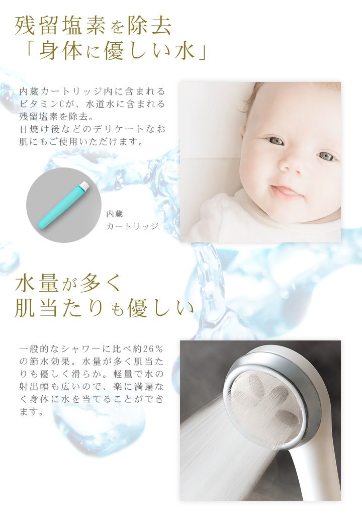 詳細:内蔵カートリッジにはビタミンCが含まれており、水道水に含まれる残留塩素の除去する他、メラニン色素還元作用とメラニン生成抑制作用もあるため、日焼け後のお肌にもご使用いただけます。一般的なシャワーに比べ約26%の節水の効果があり、節水タイプで心配される水量に関しても、十分な出力を持ち、肌当たりも優しく滑らかです。また、軽量で水の射出幅も広く、楽に満遍なく身体に水を当てることができるため、洗い流しの時間短縮にもつながっています。水道料金・ガス料金の合計を一般的なシャワーで0.5円/L、使用時間10分で計算すると(※)、年間9,490円の節約ができ、家計にも優しいバスタイムとなります。