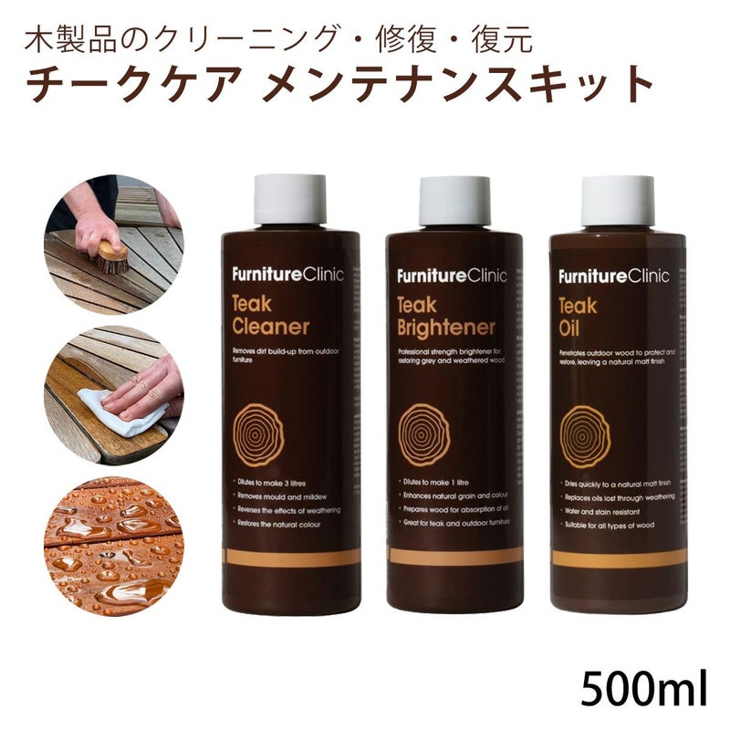 用途:チーククリーナー/薄膜層を剥がし変色したチークを元来の色調に戻す・汚れの除去、チークブライトナー/変色したチークを元来の色調に戻し木目を際立たせる、チークオイル/木材内に油分を満たし風化を抑制